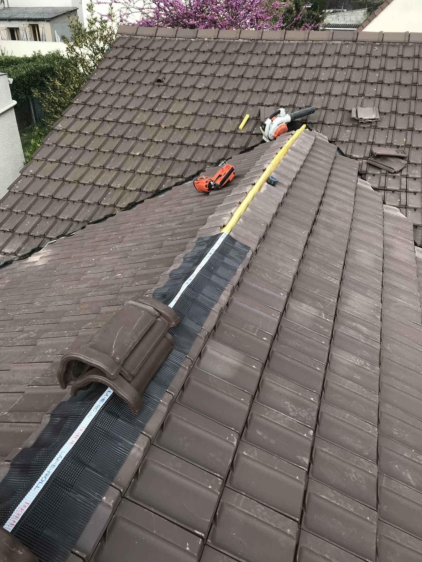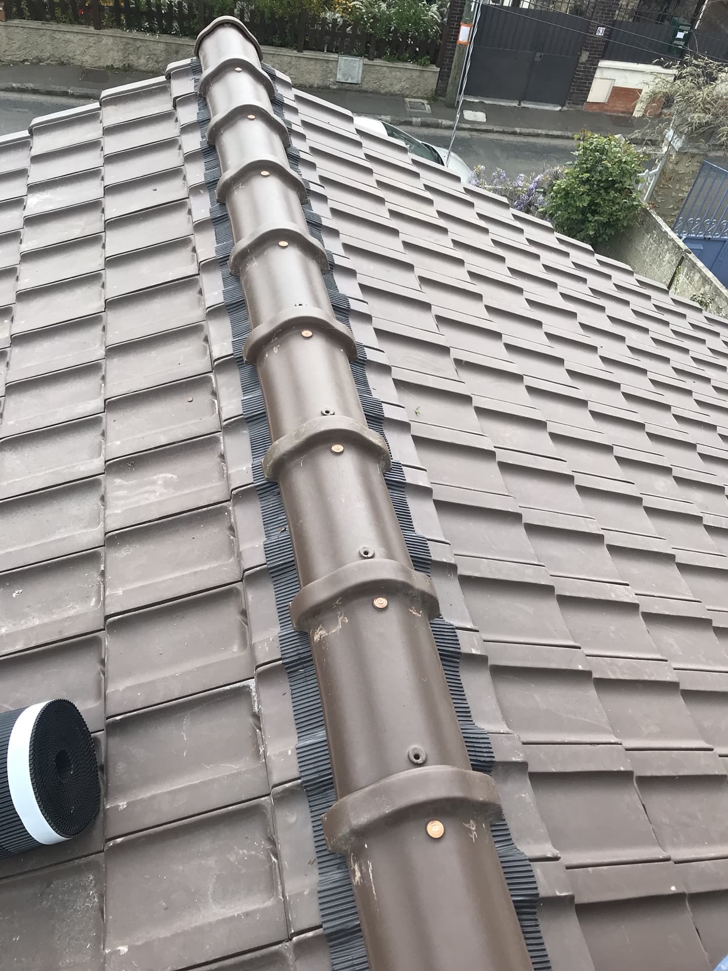 Nous sommes intervenus sur cette maison à Triel-sur-Seine (Yvelines) pour effectuer la dépose de l'ancien faîtage, mettre en place un chevron 6x4, poser un closoir de ventilation, poser un nouveau faîtage à emboitement, fixation par vis cuivre inox et reprise du joint d'étanchéité.